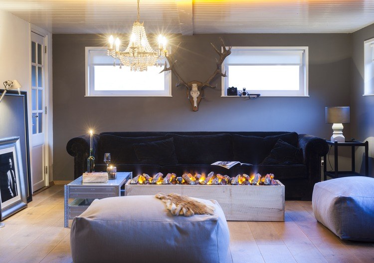 De haard is leverbaar met een optionele houtset met gloeieffect. Standaard wordt de haard geleverd met een vlakke zwarte plaat zodat u de opstelling zelf kunt decoreren.