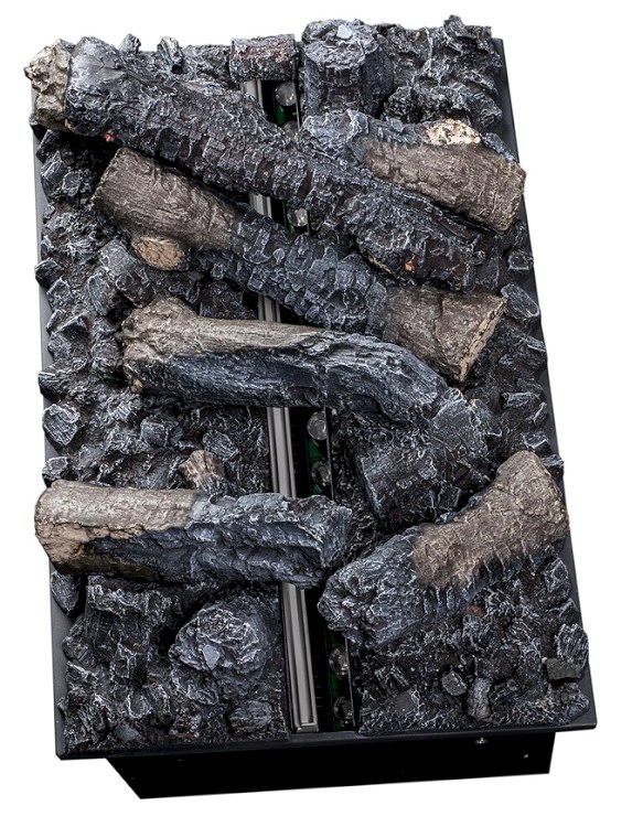 De haard is leverbaar met een optionele houtset met gloeieffect. Standaard wordt de haard geleverd met een vlakke zwarte plaat zodat u de opstelling zelf kunt decoreren.