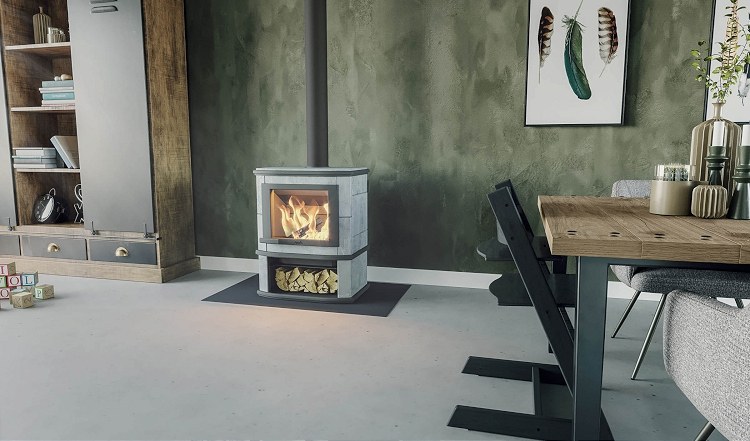 Stijlvolle speksteen houtkachel met een hoog vermogen.