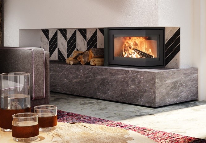 Houtgestookte hoek inzethaard voor in een bestaande open haard.