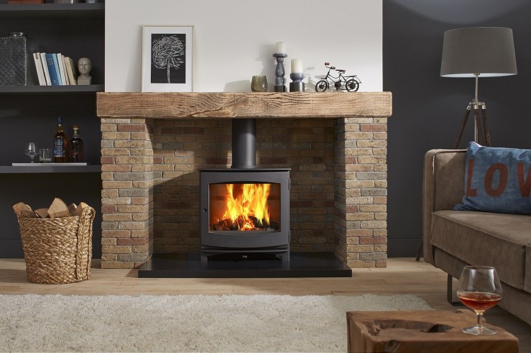 Deze lage houtkachel heeft veel vermogen, plaatstalen body en een gietijzeren deur. Het grote glas geeft veel zicht op het vuur. Deze houtkachel past goed voor uw bestaande schoorsteenmantel of schouw.