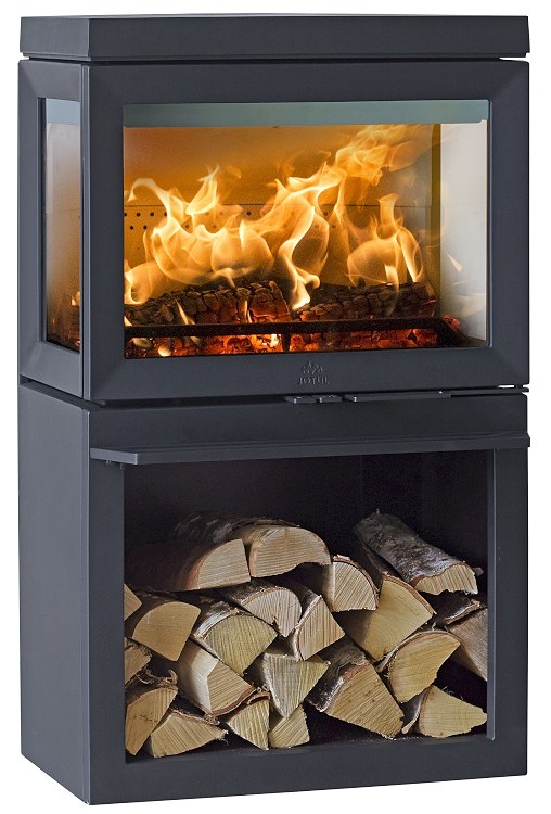 Gietijzeren houtkachel met zijglas voor een meerzijdige vuurbeleving. Er is een groot houtvak onder de kachel aanwezig.