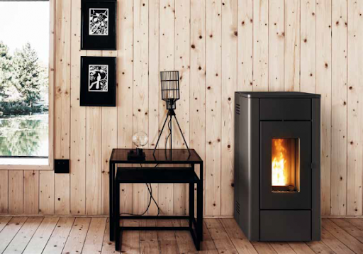 Kleine pelletkachel met grote pelletbunker.