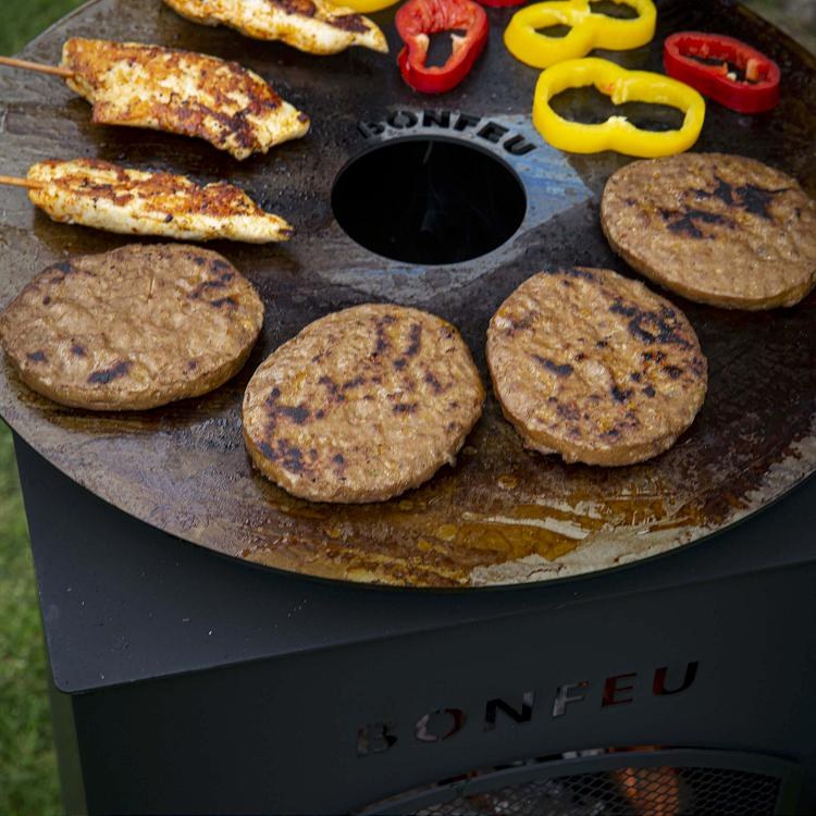 Het unieke aan de BonCarré haard is dat je hem ook als barbecue kunt gebruiken. De haard wordt geleverd met een deksel en deze deksel kun je eenvoudig vervangen door drie verschillende dingen: de BBQ grill, de wokring of de plancha. Alle drie gaan bovenop de BonCarré als je de deksel verwijdert. Je kunt de deksel ook omdraaien en gebruiken als kookplaat, bijvoorbeeld om een pot thee te zetten. En terwijl je dit allemaal doet, kun je nog steeds genieten van het vuur eronder.
