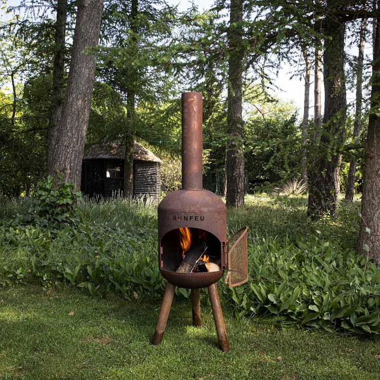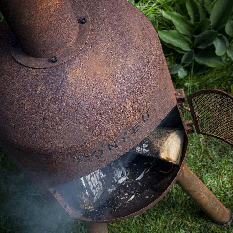 De BonSolo haard is speciaal ontworpen voor gebruik op terras of gazon. De Bonfeu-haard staat op drie stevige poten die uitschuifbaar zijn. Hij is gemaakt van staal en heeft een hittebestendige coating om de haard te beschermen. Door zijn vorm en hoge kachelpijp heeft de BonSolo een uitstekende rookafvoer en is een grote warmteafgifte gegarandeerd. Als de haard goed is opgewarmd, koelt hij slechts langzaam af, wat een constante warmteafgifte garandeert. De BonSolo is gemaakt van staal. Staal heeft de eigenschap om, onder vochtige omstandigheden, te gaan roesten. Houd er dus rekening mee dat je BonFeu-haard gaat roesten. Dit proces kan vrij snel plaatsvinden. Maar geen paniek, dit geeft jouw BonFeu haard zijn robuuste en stoere uiterlijk!